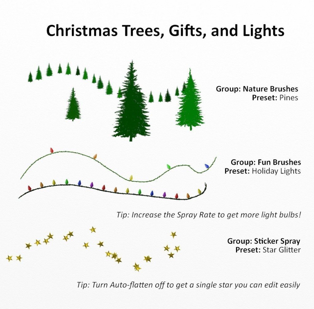 The stickers (individual images) and sticker sprays (custom brushes that use the sticker images) are a great source for last minute effects.The examples below are all from the sticker spray presets, but if you don’t need multiple stars, baubles or trees, you can always find the source image in the Stickers and use it on its own.